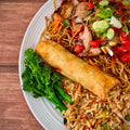 Découvrez l’assiette chinoise Shēng Kanutè, un délicieux équilibre de saveurs et de textures. Elle comprend un chow mein au porc et légumes croquants, un riz aux légumes généreusement, ainsi qu'un egg rolls au porc croustillants servis avec une sauce aux prunes douce et légèrement acidulée. Cette assiette complète vous invite à savourer un repas réconfortant, idéal pour apprécier la richesse de la cuisine chinoise maison.