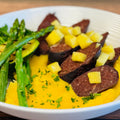Découvrez un boudin noir d’exception, délicatement enrichi de petits dés de pommes, qui apporte une touche de douceur à chaque bouchée. Servi sur une mousseline onctueuse de pommes de terre et carottes, il se marie à merveille avec des légumes frais pour un repas équilibré et savoureux. Un choix parfait pour ceux qui recherchent un plat réconfortant et de qualité.